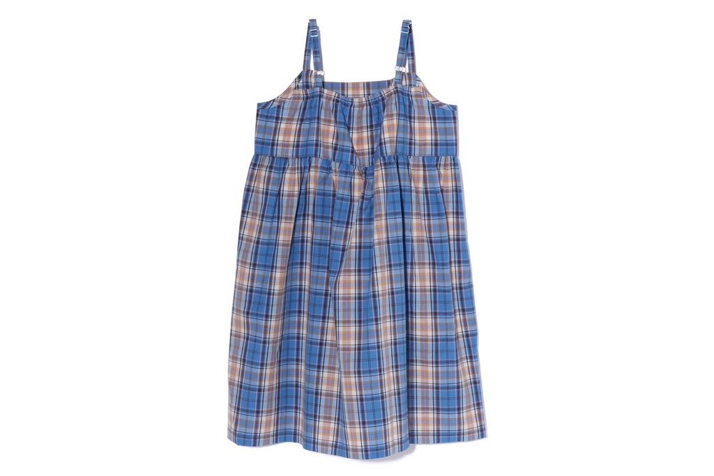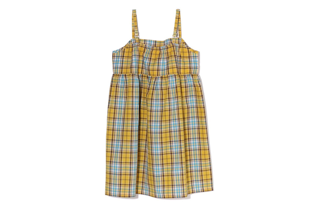 コットン素材の明るいマドラスチェック生地を使用したキャミソール型ワンピース。胸元にBABY MILO FACEモチーフを刺繍で表現したデザイン。肩紐にはリボンが付属、長さは調節が可能な仕様。左裾にピスネームを挟み込み。ガーリーなAラインシルエット。