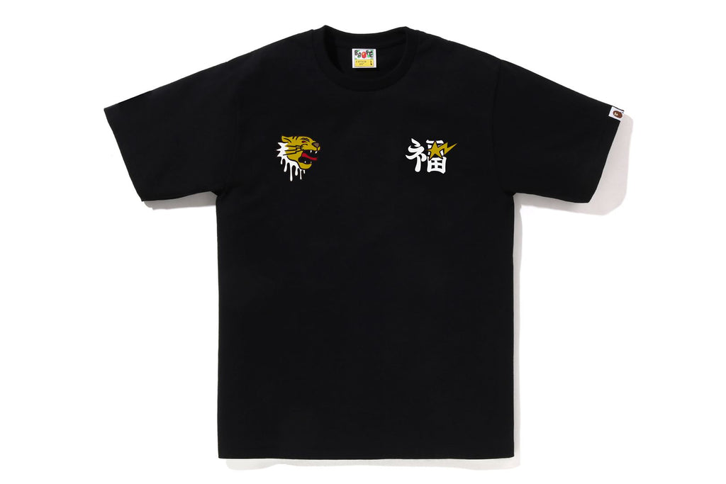 USA製コットンで作成したオリジナルの丸胴ボディを使用したショートスリーブTシャツ。フロントに“虎”、“福”のモチーフ、バックはABC CAMO柄日本列島に龍が巻きついたデザインをラバープリントで表現したデザイン。左袖にAPE HEAD柄ピスネームを挟み込み。レギュラーフィットシルエット。