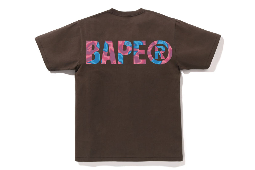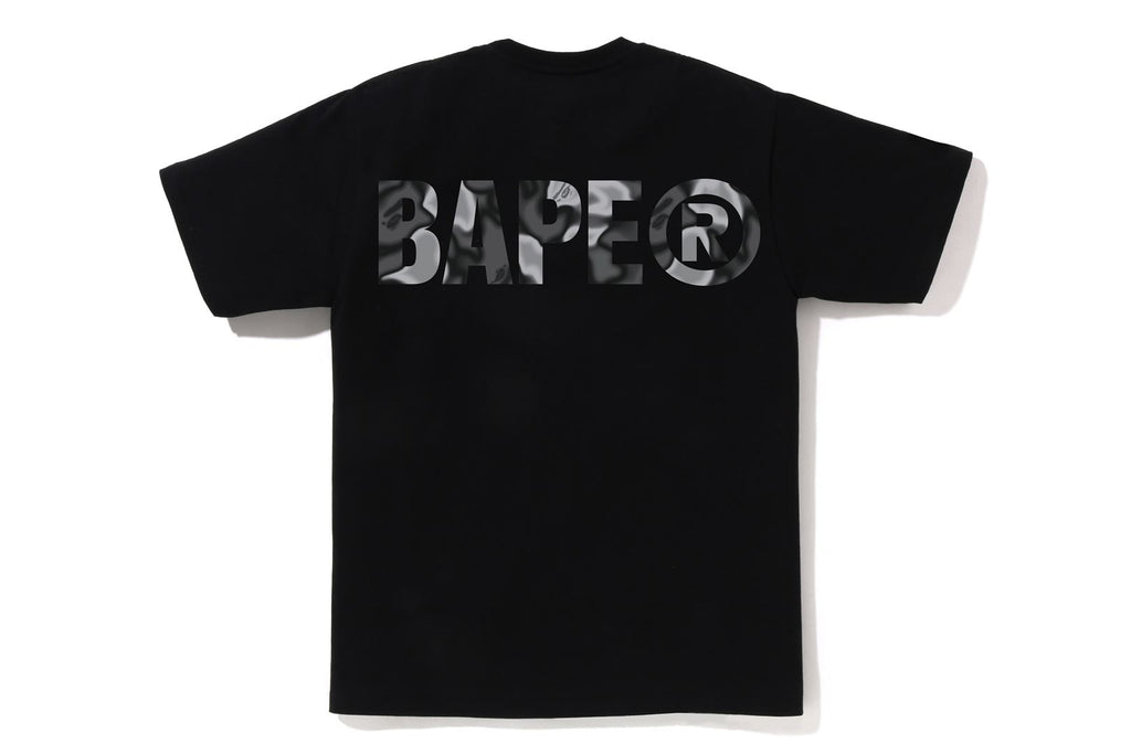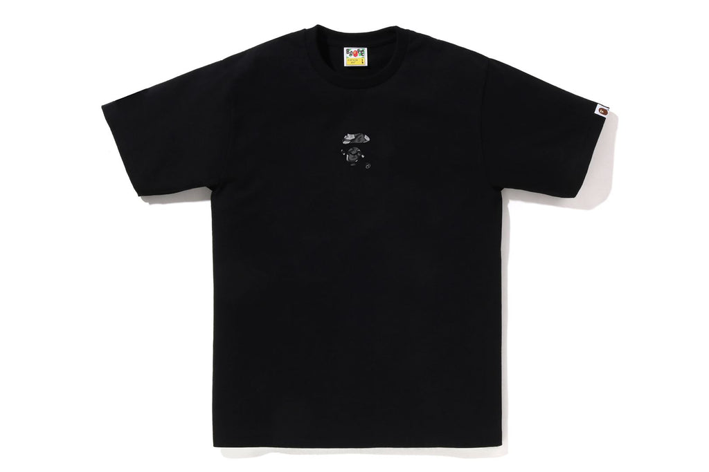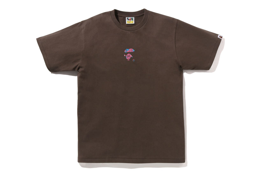 USA製コットンで作成したオリジナルボディを使用したショートスリーブTシャツ。フロントにLIQUID CAMO柄配色で表現したSMALL APE FACE・バックにBAPE®ロゴをラバープリント。左袖にピスネームを挟み込み。レギュラーフィットシルエット。