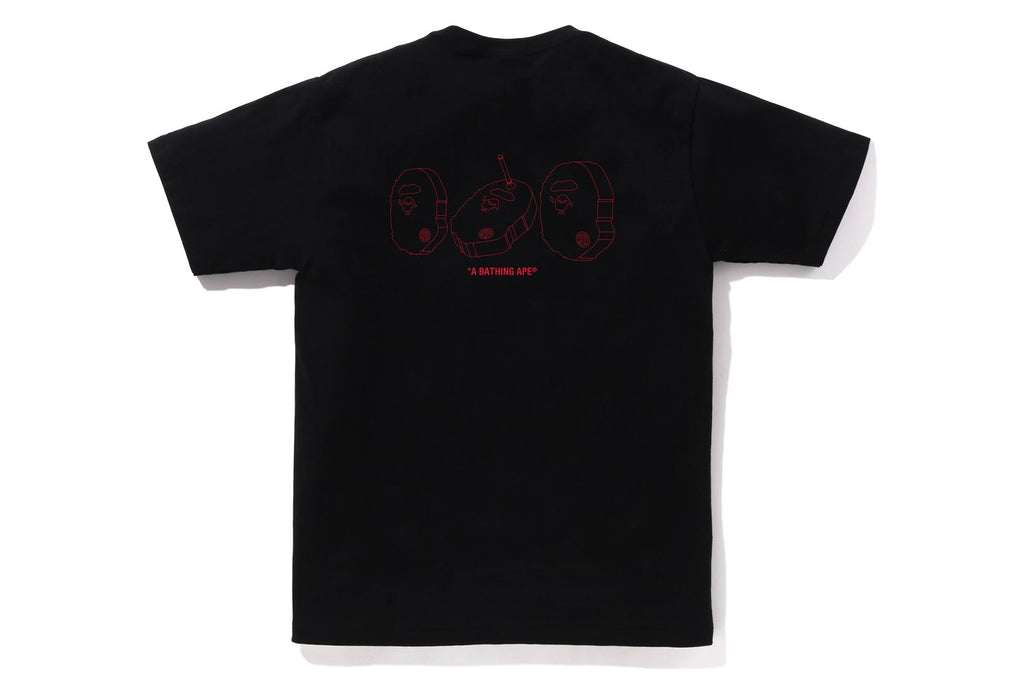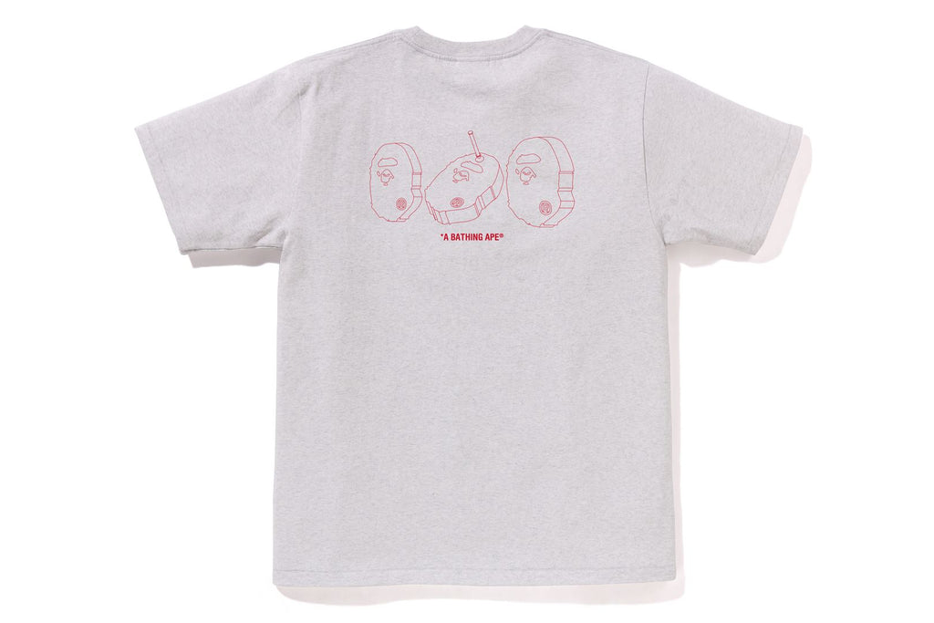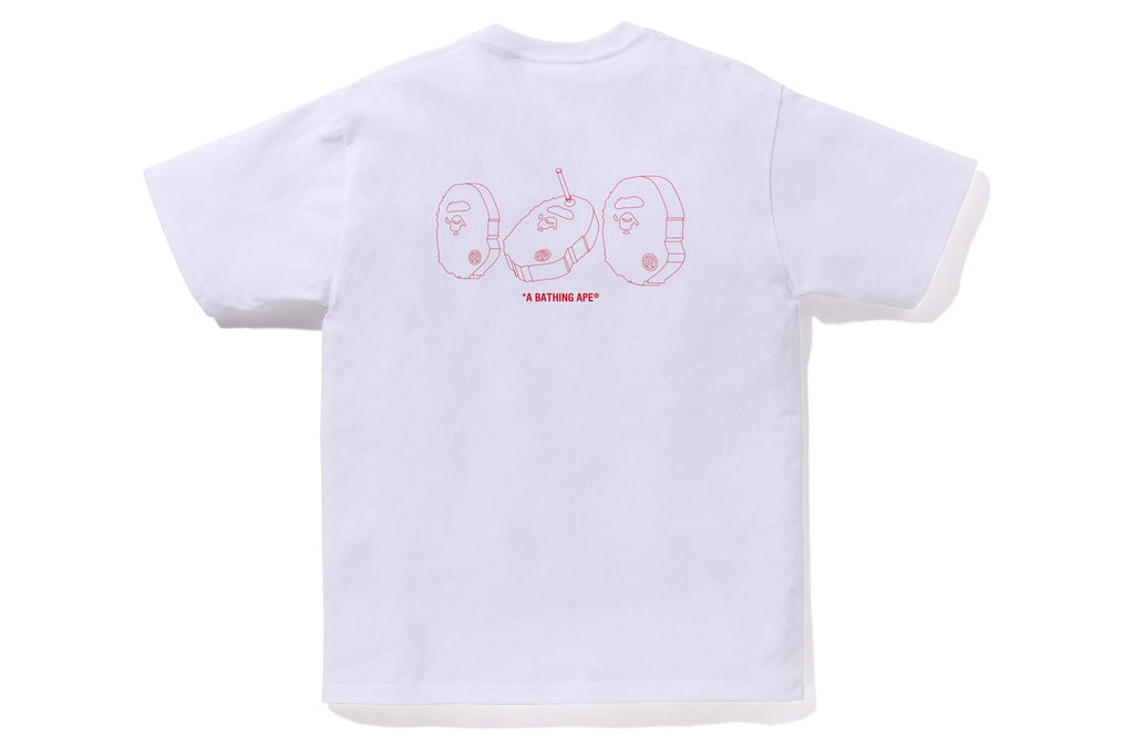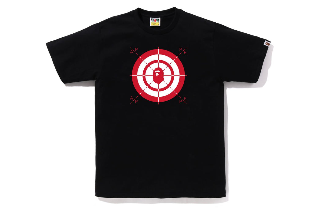 USA製コットンで作成したオリジナルの丸胴ボディを使用したショートスリーブTシャツ。フロントとバックに射的をモチーフにしたAPE HEADをラバープリント。左袖にAPE HEADピスネーム。レギュラーフィットシルエット。