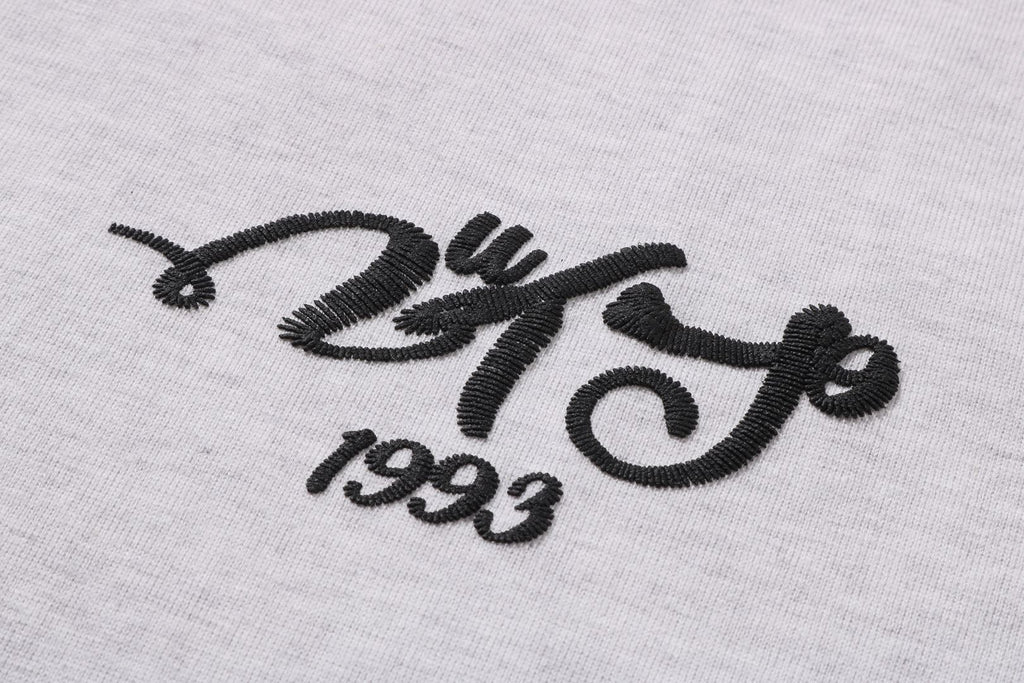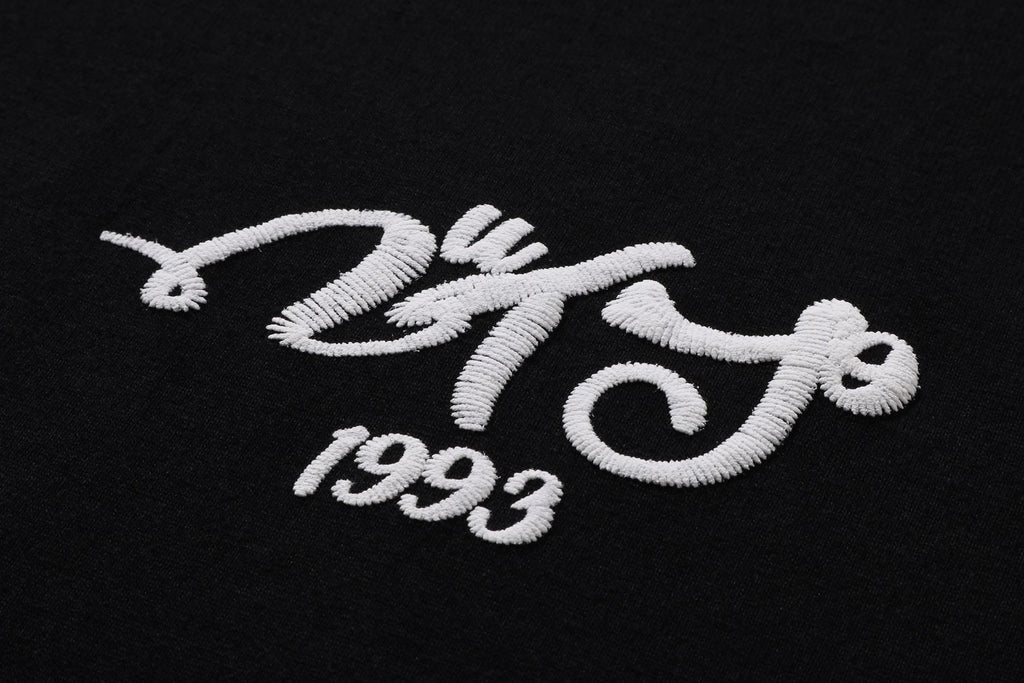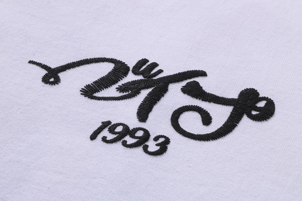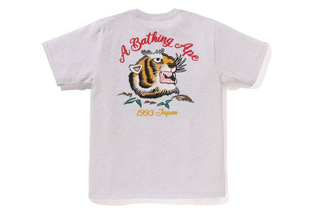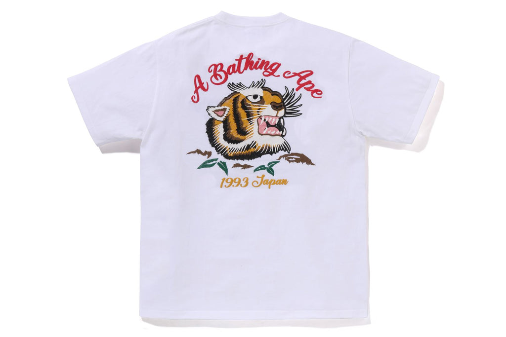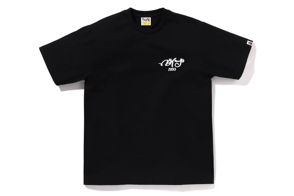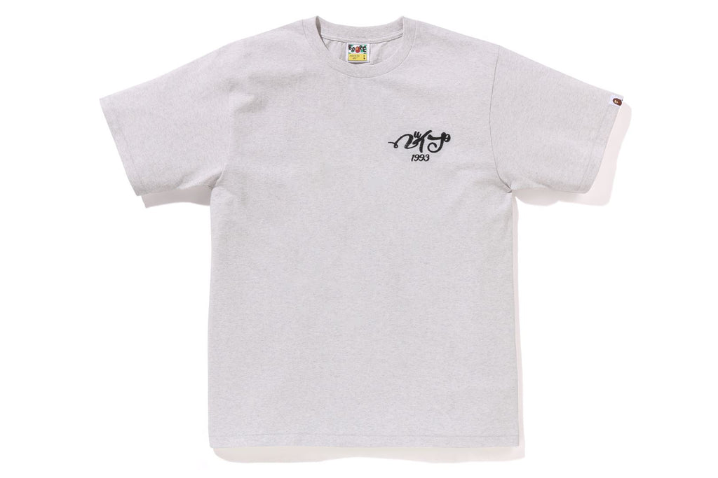 USA製コットンで作成したオリジナルの丸胴ボディを使用。左胸・背面に刺繍風の発泡プリントを施したショートスリーブTシャツ。左袖にAPE HEADピスネーム。レギュラーフィットシルエット。