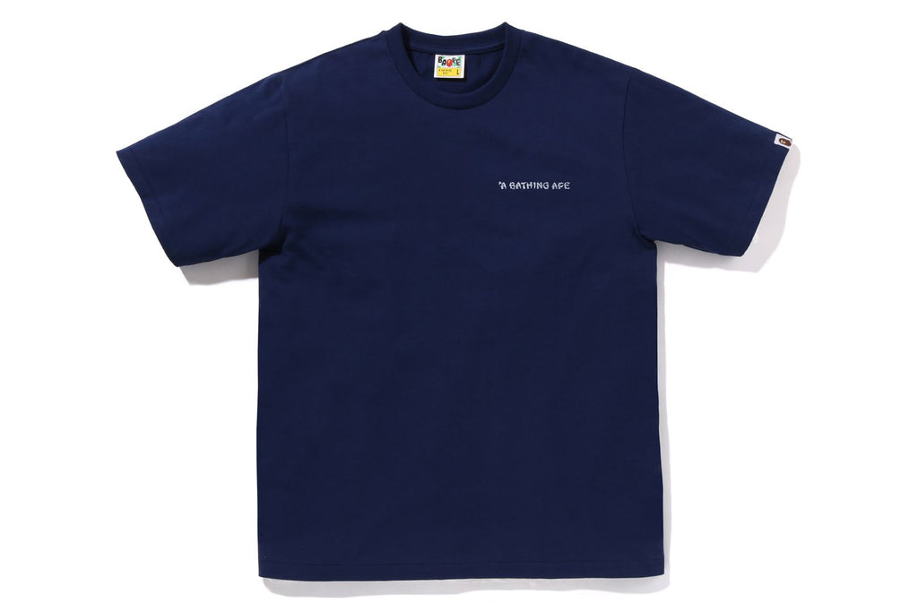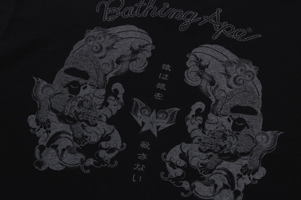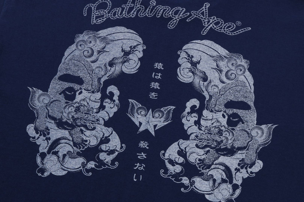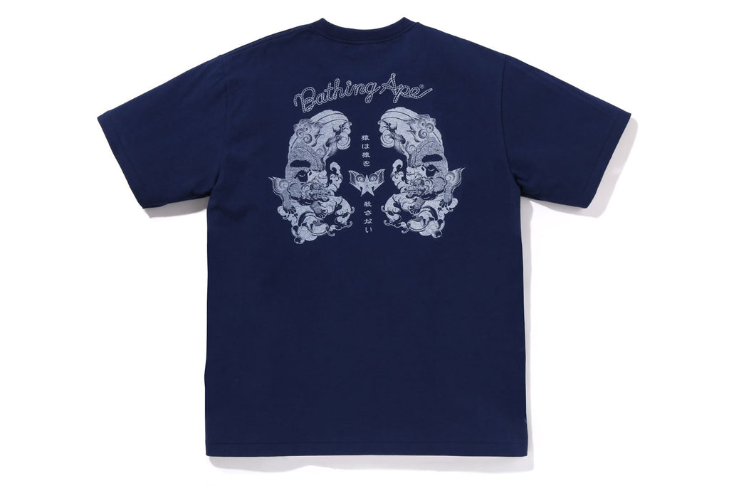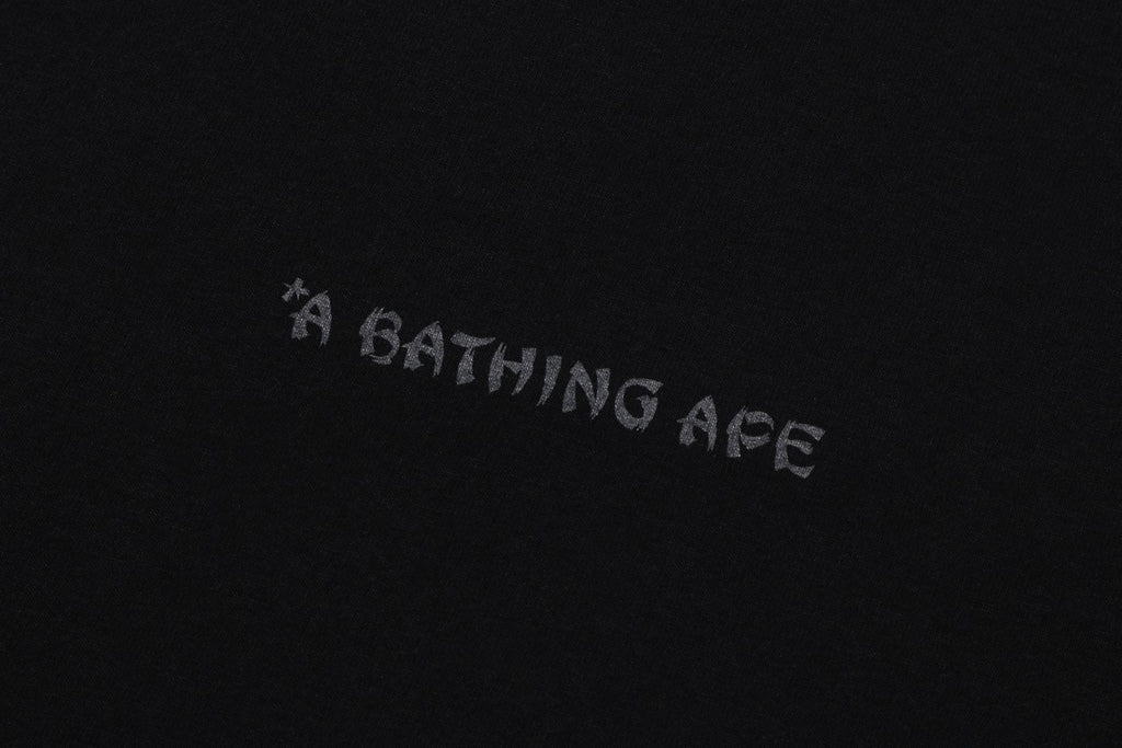 USA製コットンで作成したオリジナルの丸胴ボディを使用したショートスリーブTシャツ。左胸にブランドロゴ、バックにJAPANESE TATTOO調にアレンジしたAPE HEADモチーフのラバープリント。左袖にAPE HEADピスネーム。レギュラーフィットシルエット。
