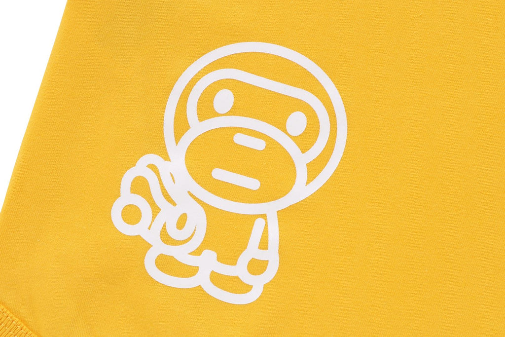 コットン/レーヨン/ポリウレタンの3種混紡ストレッチ天竺素材を使用したショートスリーブTシャツ。フロントにホットドックモチーフ、バックにホットドックを食べるBABY MILO🄬をラバープリント。左袖にAPE HEADピスネーム。身幅にゆとりのあるシルエット。