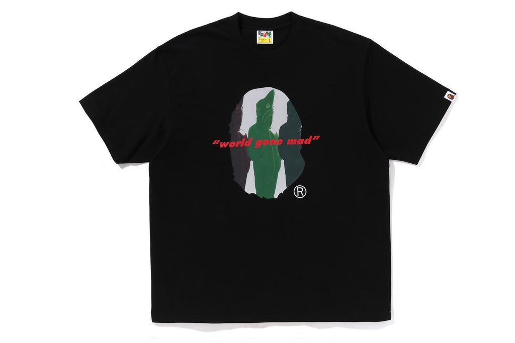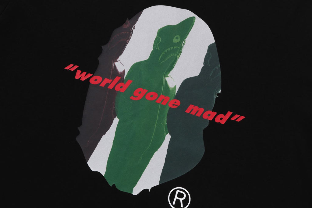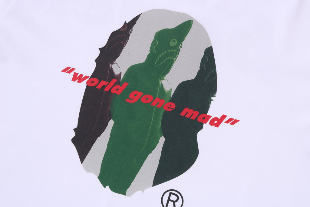 コットン天竺のオリジナルボディを使用したショートスリーブTシャツ。フロントにSHARK SEIJIN APE HEADグラフィック、バックにbapeロゴをラバープリントで表現。左袖にピスネーム、身幅にゆとりのあるシルエット。