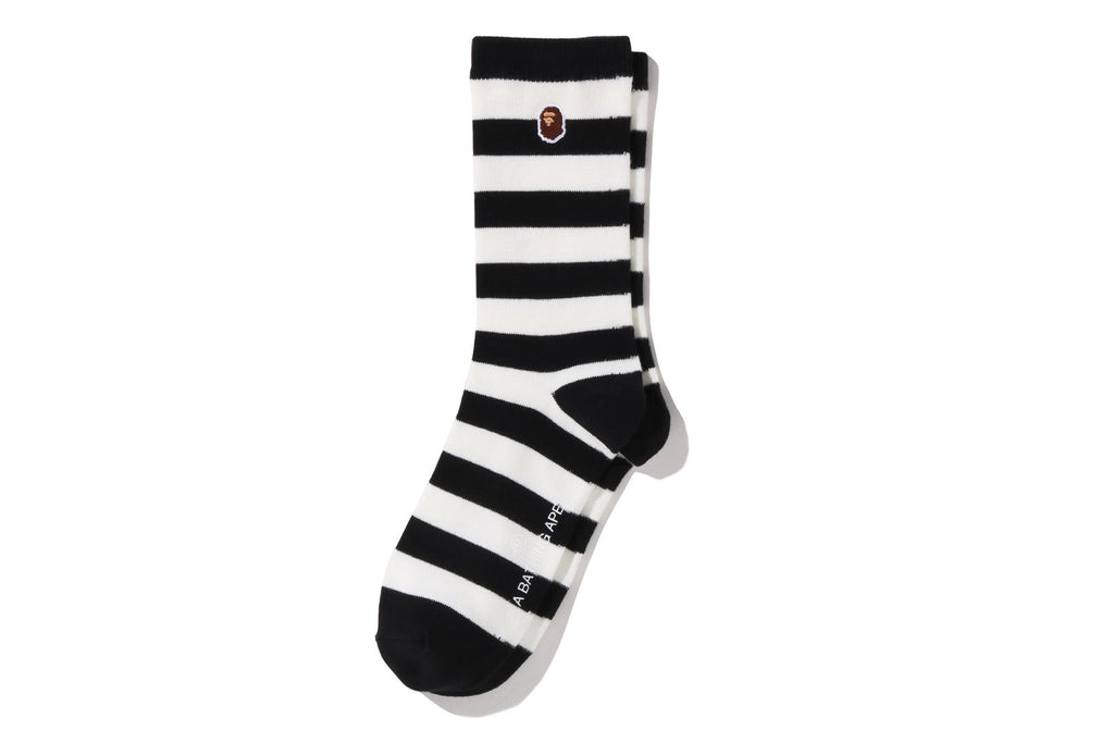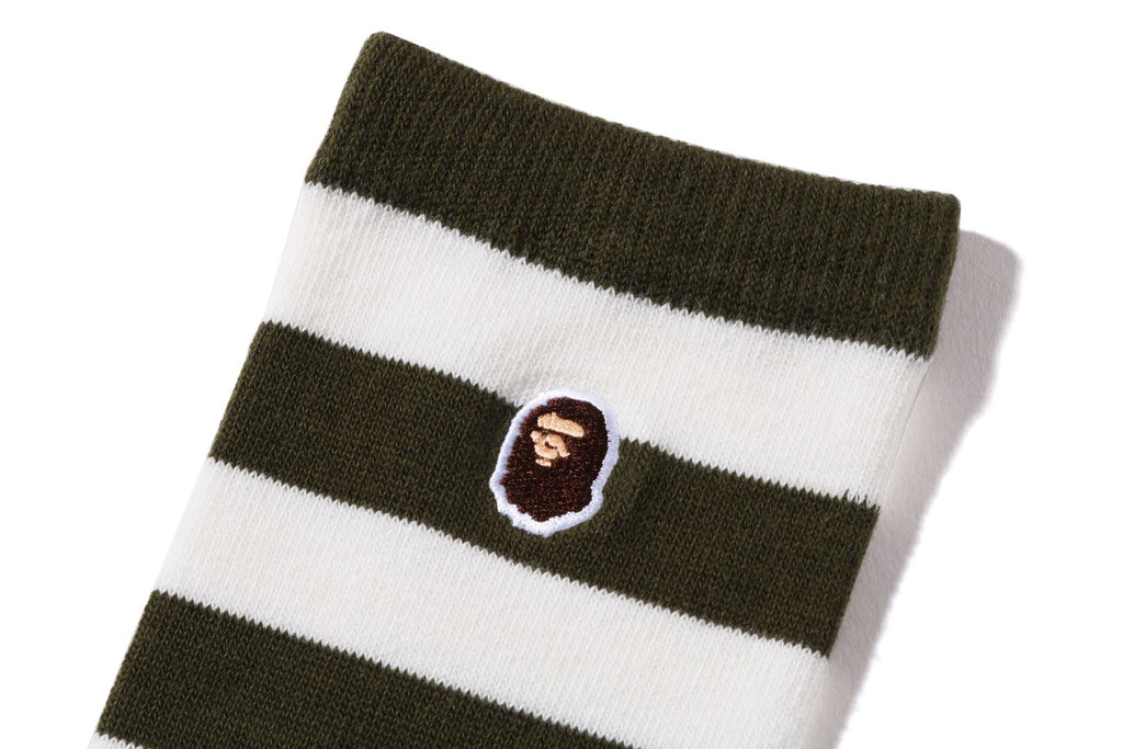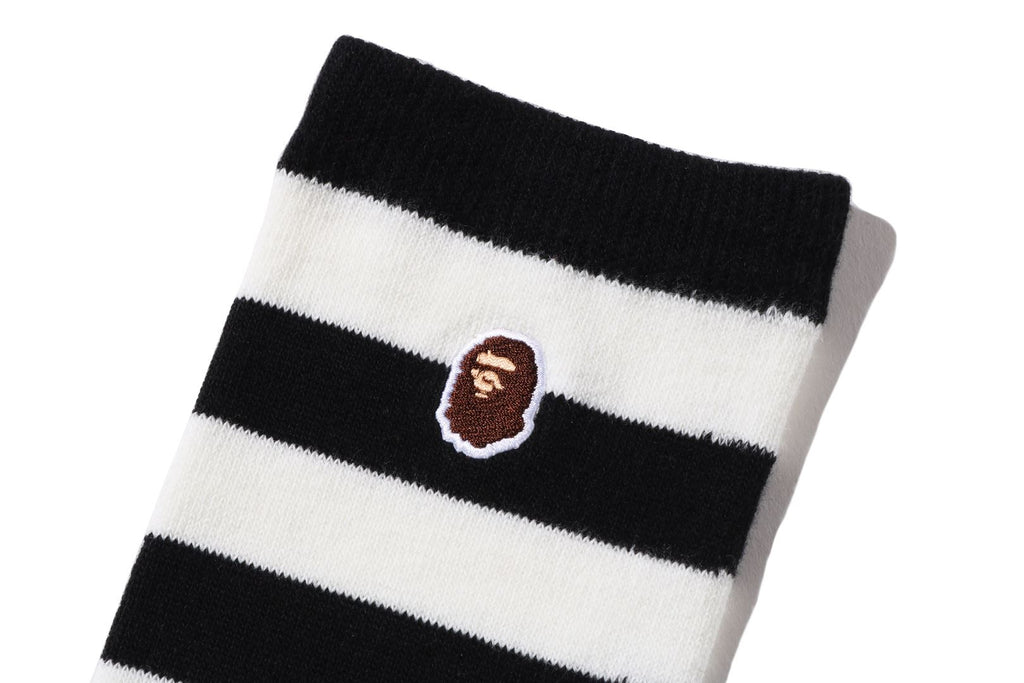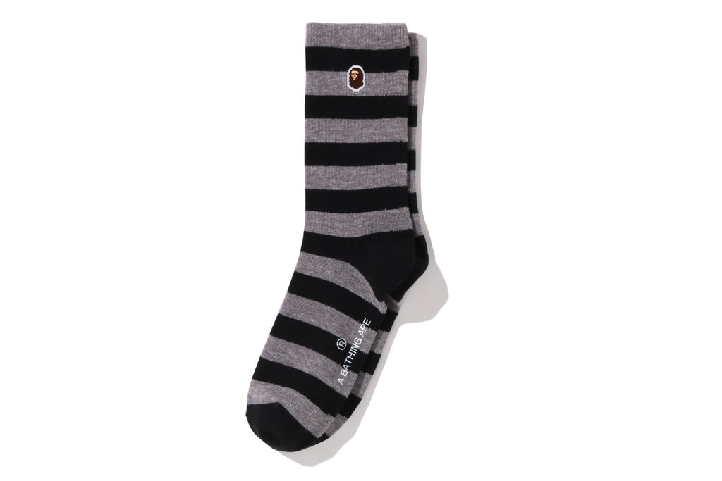 コットン / アクリルの混紡素材を使用したロングソックス。履き口にAPE HEADのワンポイントワッペンを叩きつけ、レッグ全体をボーダー柄をジャガードで表現したデザイン。底面にブランドロゴをラバープリント。5色2サイズ展開。