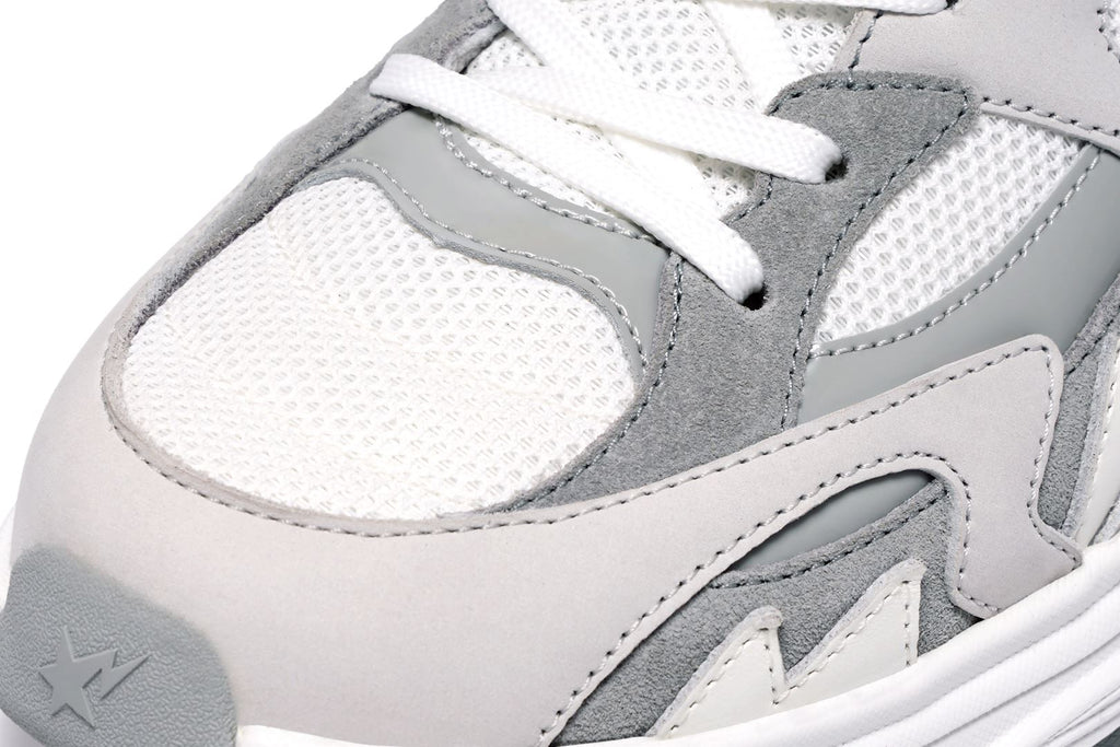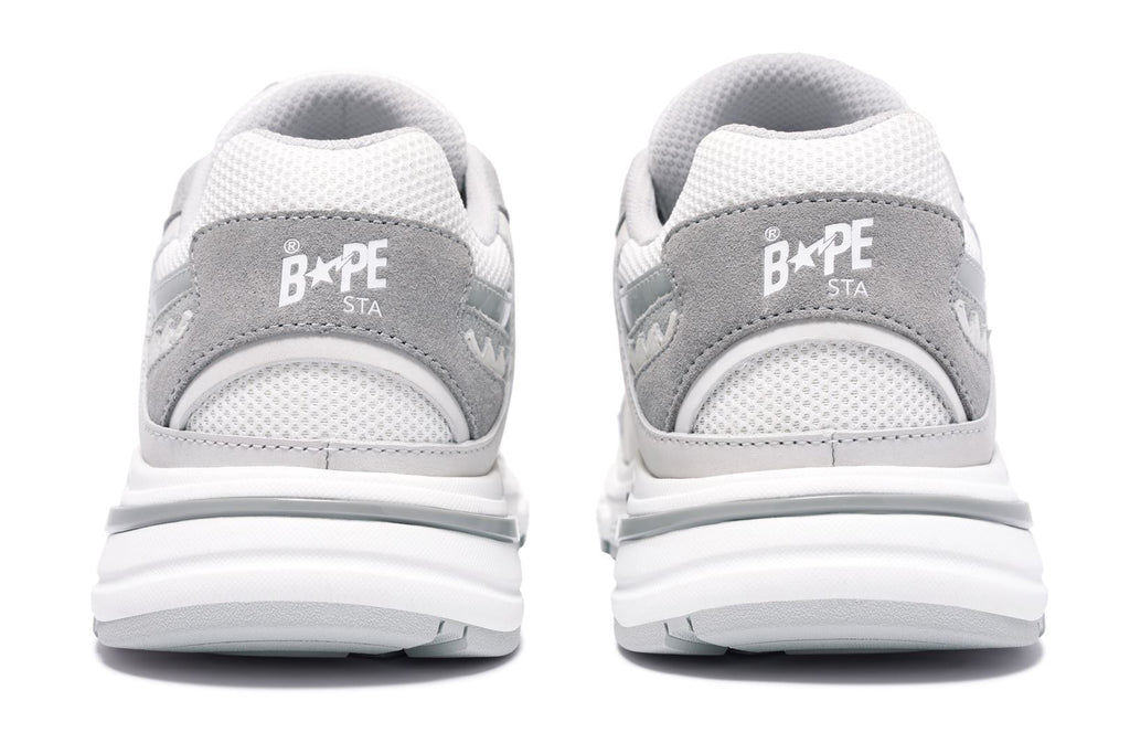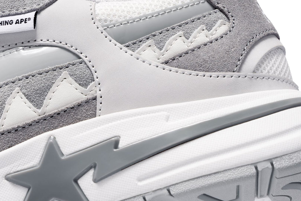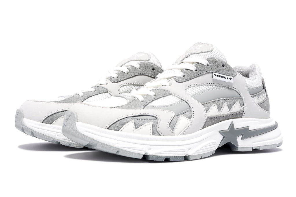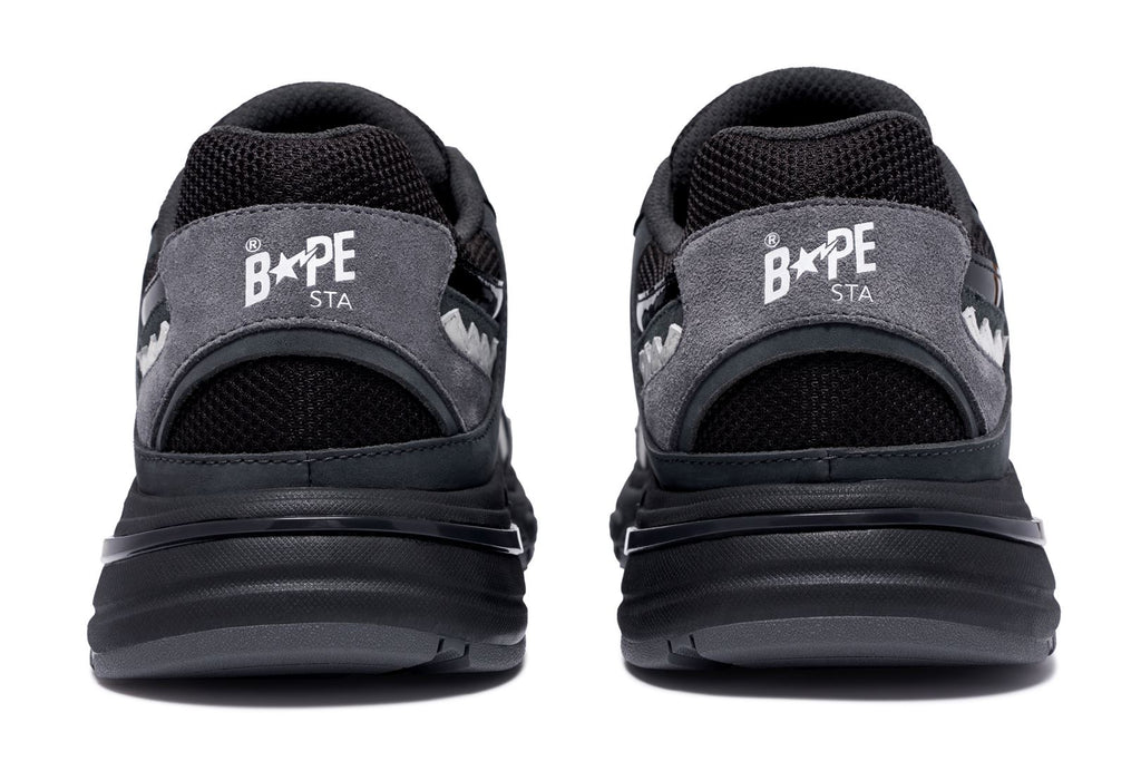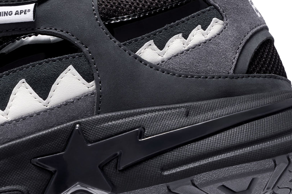 ユニークなサメのグラフィックからインスピレーションを得たフットウェア「SHARK STA」、「SHARK HOODIE」のエッセンスをデザインに落とし込み、サメの歯をモチーフにしたオーバーレイや、ミッドソールのSTA、サメのエラにインスパイアされたブランドロゴ入りのアーチ、ウェーブパターン入りの分厚いアウトソールなど、プレミアムな素材使いから細かいディテールに至るまで、BAPE®︎のクラフトマンシップを表現。
